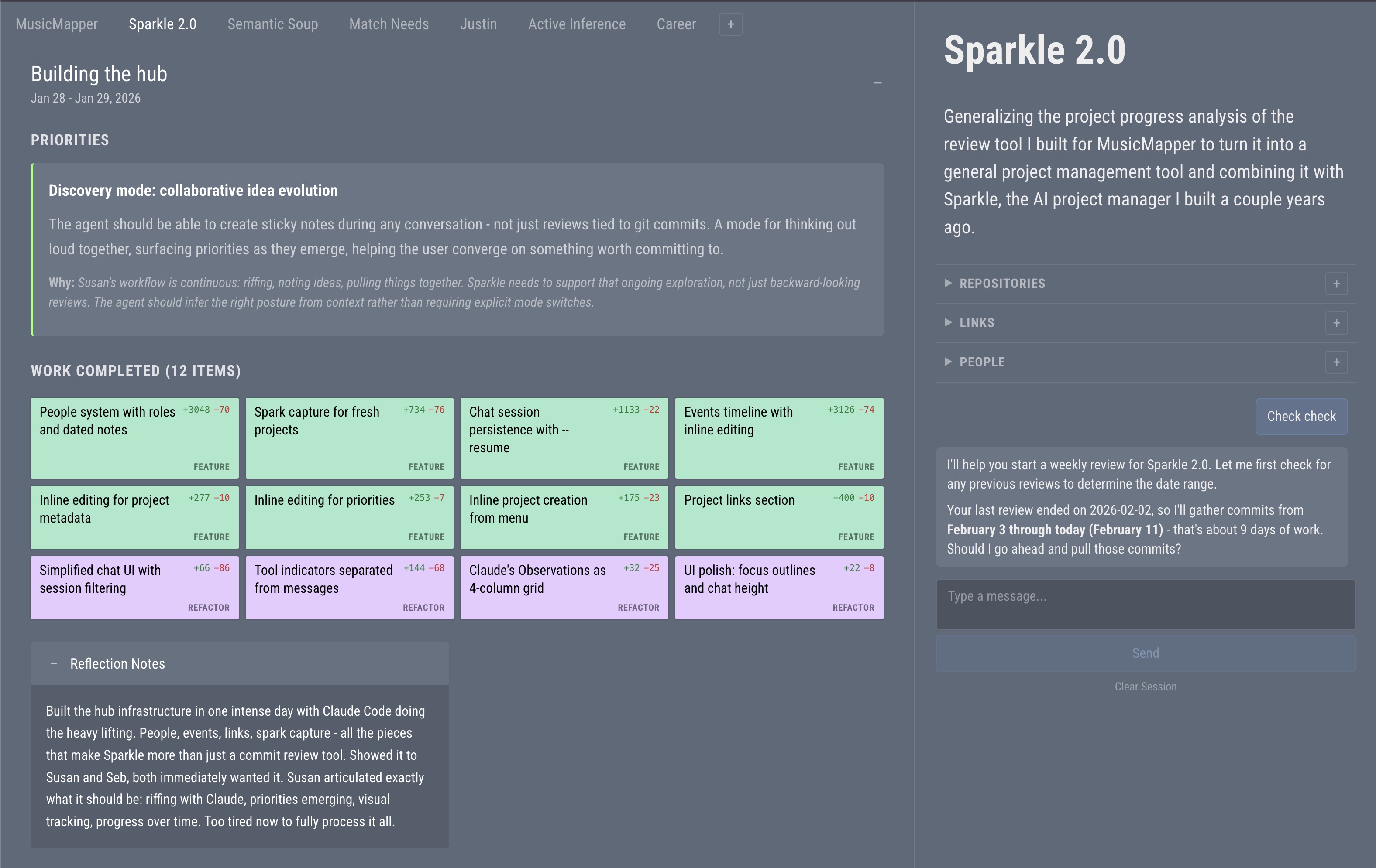 Turns your week of work into a spatial overview. Reads your repository history and transforms commits into sticky notes, then uses conversation with Claude to surface what actually mattered, what emerges next, and whether the pace is sustainable.